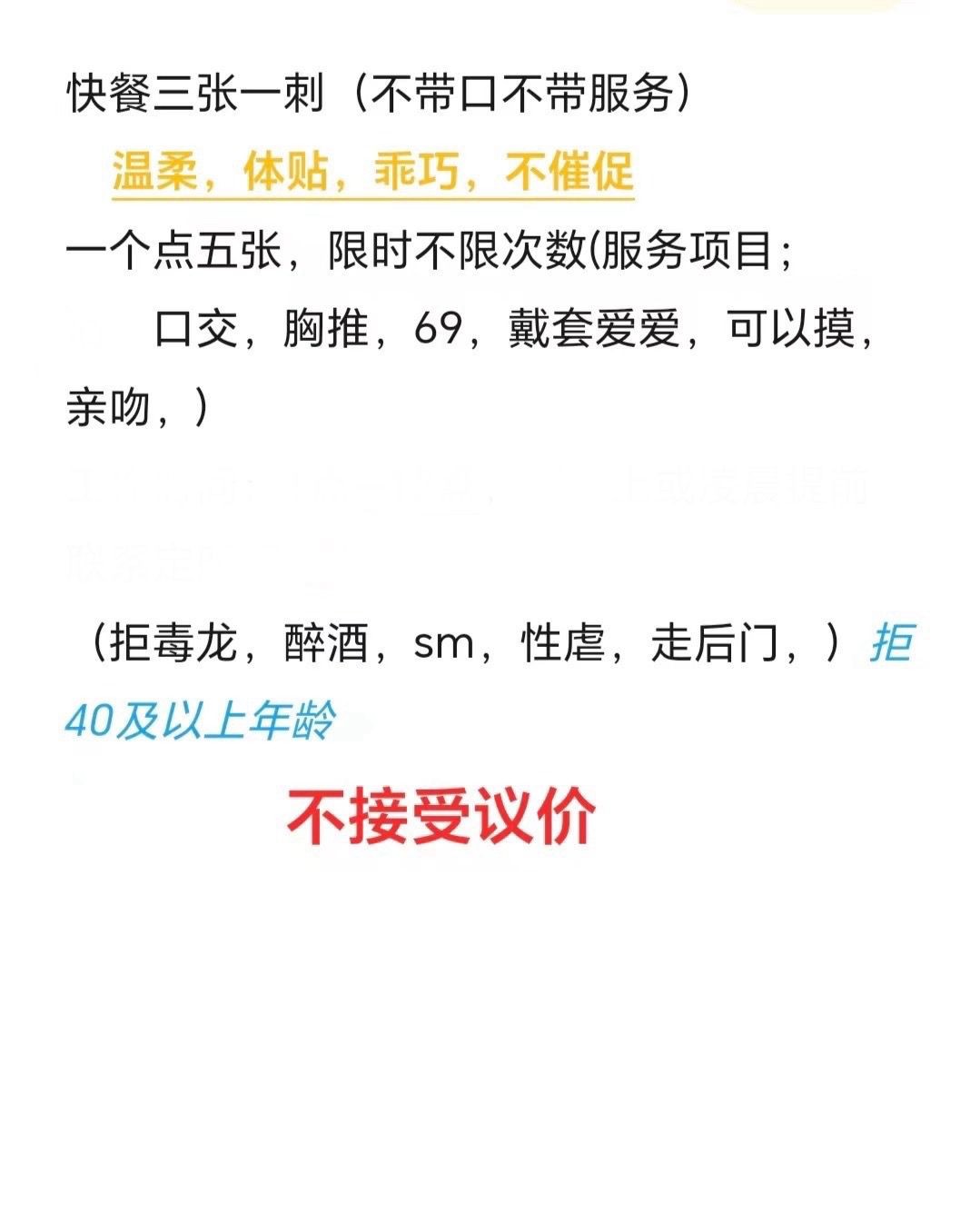 挺不错的一个妹子,服务态度都可以,五张包时的价格挺实惠,但是坦度确实高,适合好这口儿,喜欢开坦克的。妹子虽然坦度高,但是讲卫生,身上没有异味,长得也说得过去,我是感觉比路边两张的站街强,而且安全系数也高一些,时不时开把坦克解解渴我觉得是挺好的